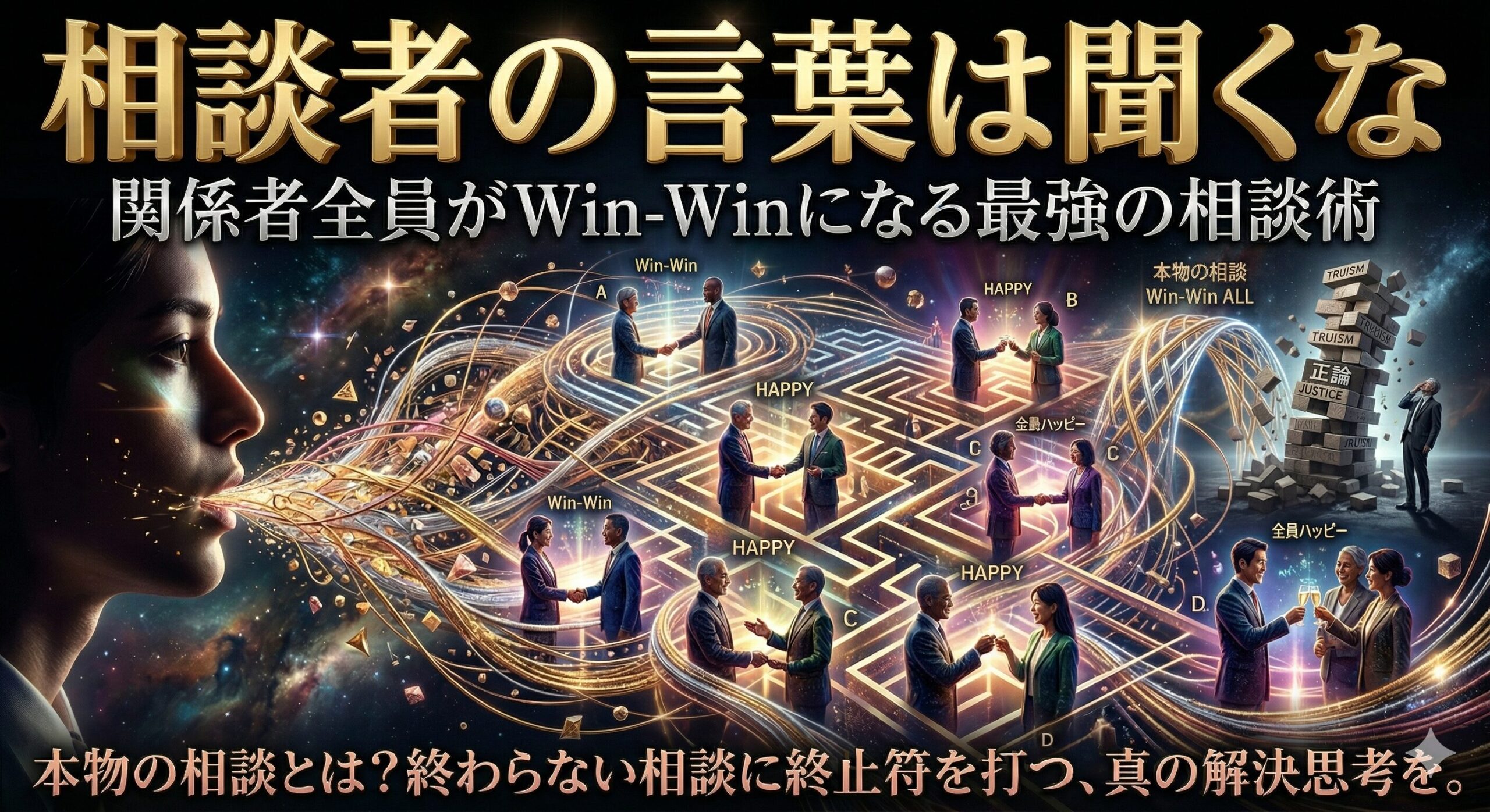 本当に相手のお悩みが解消される相談術とは「 相談者(Aさん)の言葉を100%真に受けないこと 」です。 そして、「 Aさんと、その先にいる第三者(Bさん)が共にHappyになる道(Win-Win)を探ること 」です。
