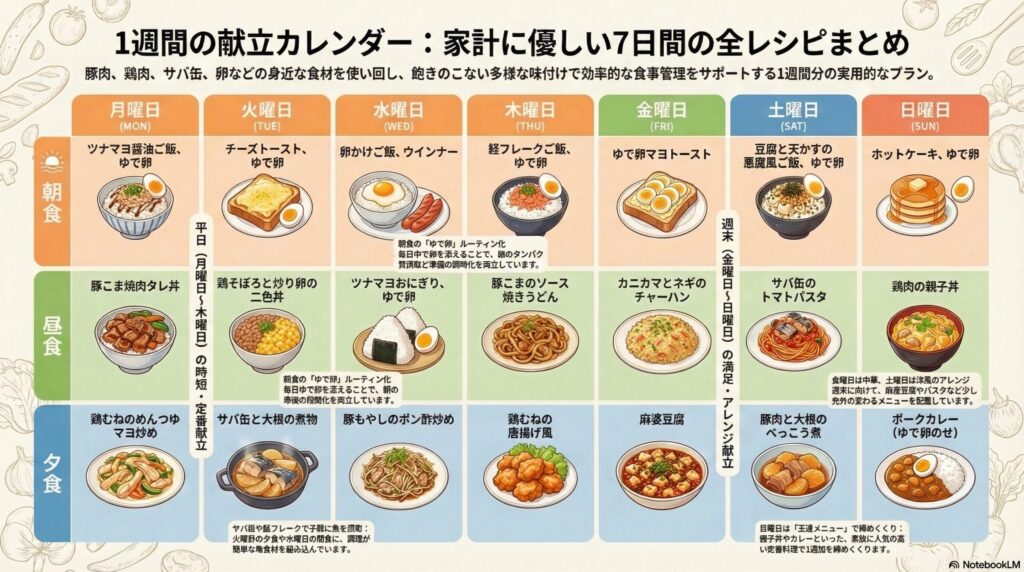 「 Gem=私専門のAIコーチ 」が考えてくれた献立表を、ビジュアル化してもらうのもGoogle AIです。今回はNotebookLMのインフォグラフィックで生成してもらいました。