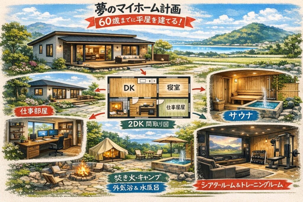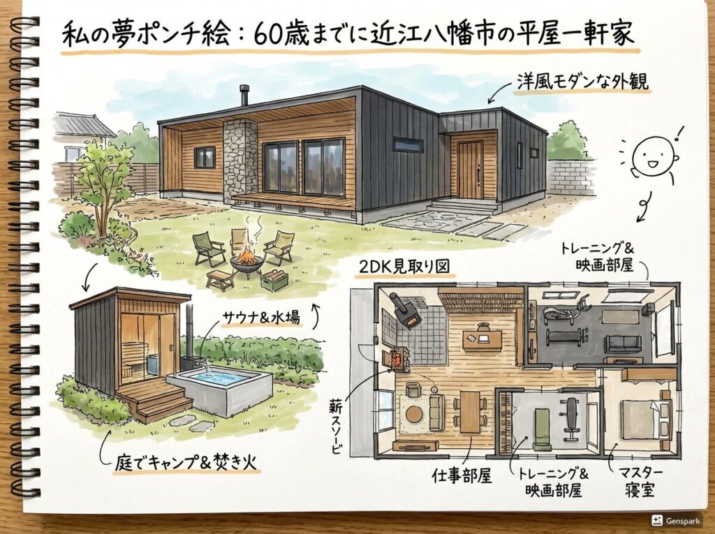 「 お一人様 」「 引き篭もり 」の快適解!な一軒家で過ごす自分…。そんなインフォグラフィックを生成してニタニタしています。よく観てもらうと分かります。間取りめちゃくちゃです。テキトーに「 サウナ 」「 シアタールーム 」とかアバウトな妄想を与えているだけやから細部は無茶苦茶です。が、それで良いんです。それが良いんです。
