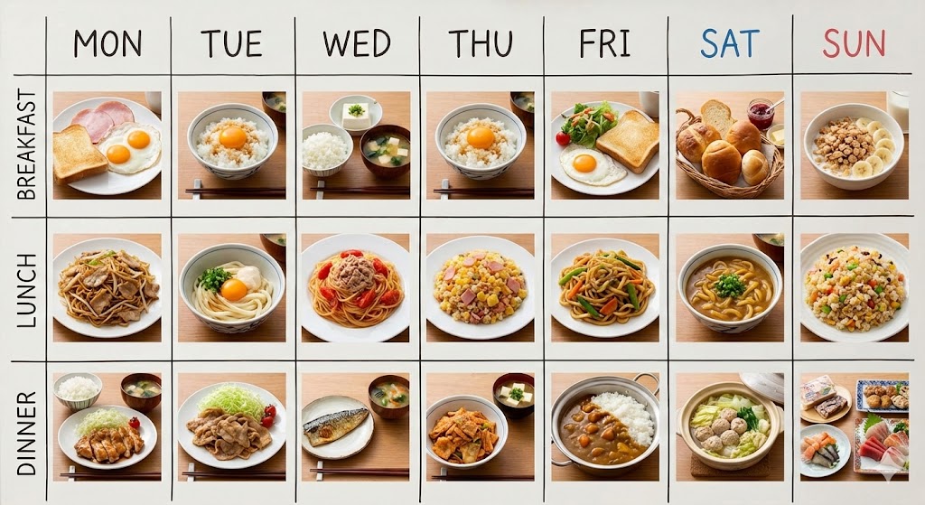 月曜日から日曜日を横軸、朝昼晩を縦軸にメニュー表一覧を画像で人目でわかるように生成して写真かイラストで視覚的に直感でわかるように(Nano Banana Pro)