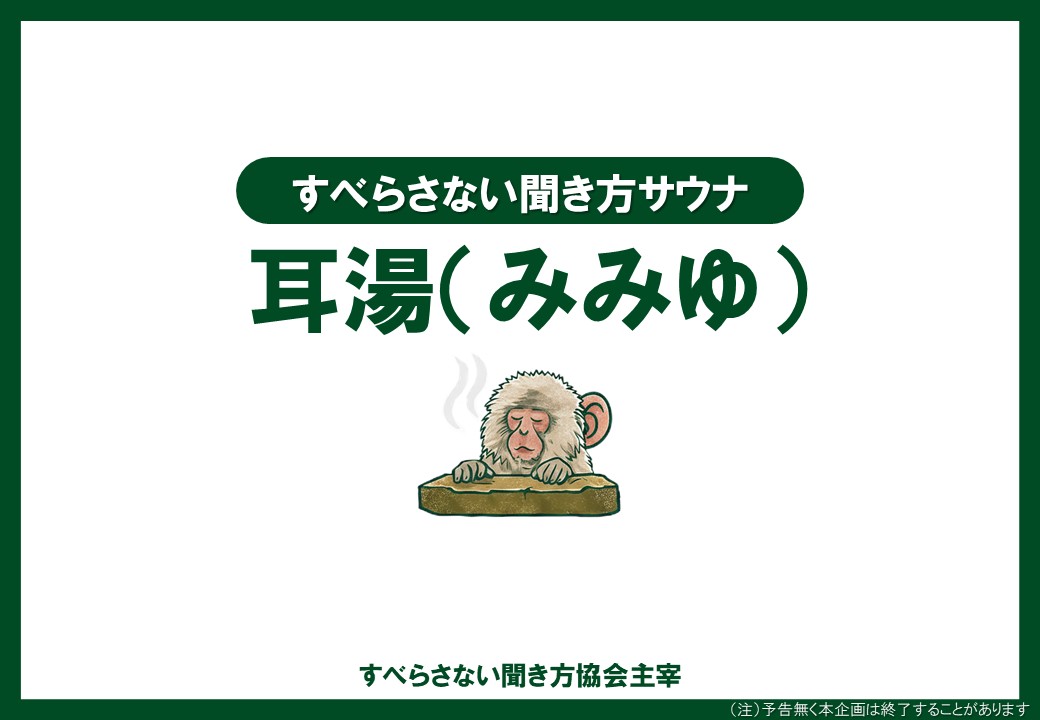 日々に忙殺され、すべらさない聞き方を忘れる中、月一回サウナ的にととのえる場、セルフメンテナンス機能の場。すべらさない聞き方へ意識をととのえるサウナ的場なので「 耳湯(みみゆ) 」