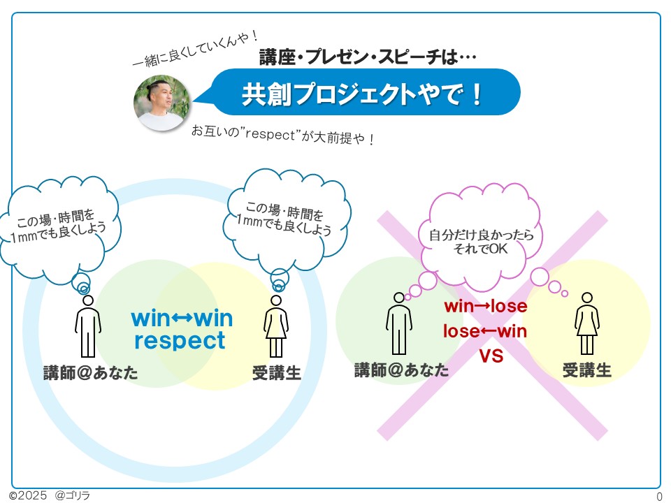なんでやねん!で、あなたのプレゼンを劇的に変えます。私はプレゼン研究者ではありません。数千回の実践を繰り返してきた実践者です。アホみたいな数のプレゼンを実践し続けたことで「 世の中の成功法則は外向型向きで、内向型では使いづらい 」ことに気づけました。内向型の私があなたの代わりに「 使えるノウハウ使えないノウハウ 」の仕分け作業は終わらせておきました。私が実践で学んだ最も重要な結論は「 人間性を高めること 」です。人間を知り、やさしい人間になることです。シンプル思考・本質・論点をリアルな人間心理に基づいて、実践で成果が出るプレゼン術&メタ思考を綴ります。「 講座 」「 著書 」「 ブログ 」「 音声 」で、何度も何度も何度も、復習・学び直しを続けていただけるように、同じことを100万回発信し続けます😁
