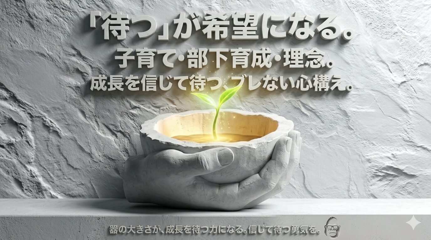今作は「 待つ 」がテーマということなんで、子を持つ親やメンバーを持つリーダーは、深部で震える気づきがあるのではないかと予測しています。ほとんどの親やリーダーは「 待てずについ口や手を出してしまう 」のです。が、そのことが相手の成長機会を奪ってしまう可能性について自覚がありません。それが深部の問題であり、いわゆる指示待ち族を量産してきた日本の闇構造でもあります。